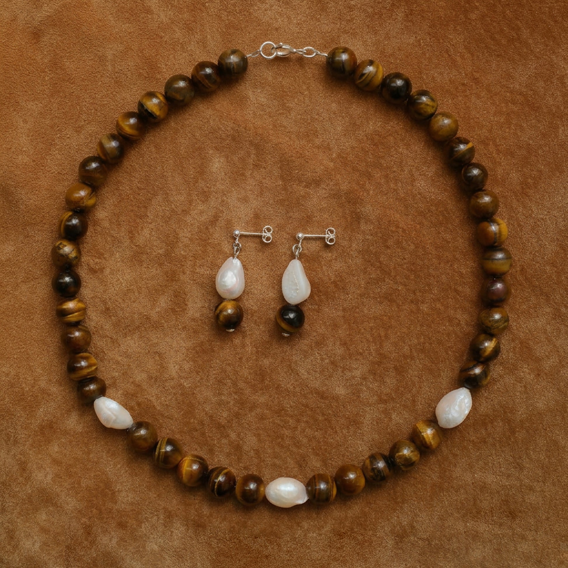 Minimalistyczne kolczyki wykonane ze srebra próby 925 oraz tygrysiego oka i perły. Kamień charakteryzuje się głębokim, brązowo-złotym kolorem i jedwabistym połyskiem, który efektownie mieni się przy każdym ruchu.