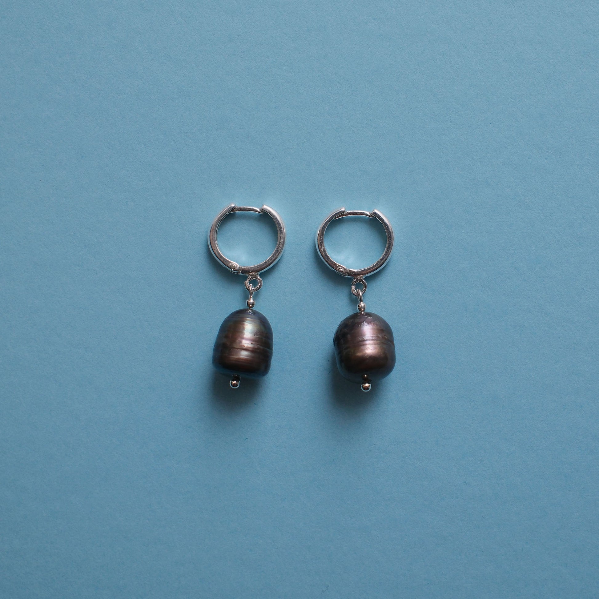 Zaprojektowane i ręcznie wykonane w Polsce wiszące kolczyki ze srebra próby 925 z metaliczną, nieregularną perłą, zakończone wygodnymi zapięciami typu bigiel. Wyraziste kolczyki z naturalną perłą o pięknym połysku - srebrna biżuteria dla osób szukających oryginalnych kolczyków z perłami o eleganckim charakterze.